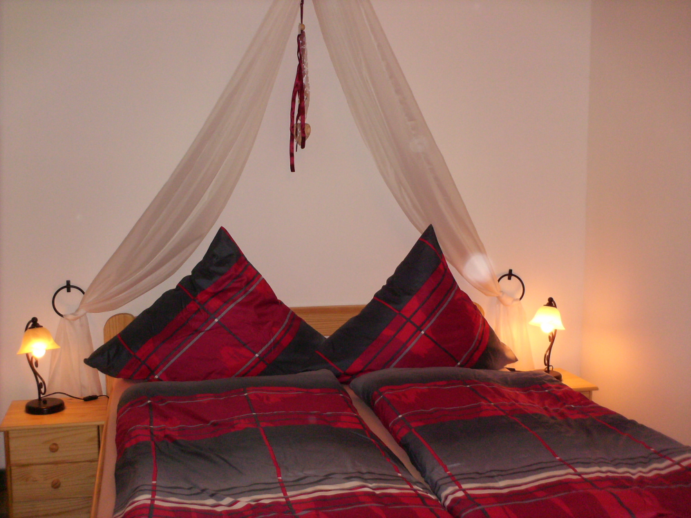 In zwei, im Landhausstil eingerichtete gemütliche Schlafzimmer, befinden sich jeweils ein Doppelbett mit zwei Nachttischen sowie ein Kleiderschrank mit ausreichend Platz für Ihr Reisegepäck, sowie ein kleiner Tisch mit 2 Stühlen. Bettwäsche wird gestellt.